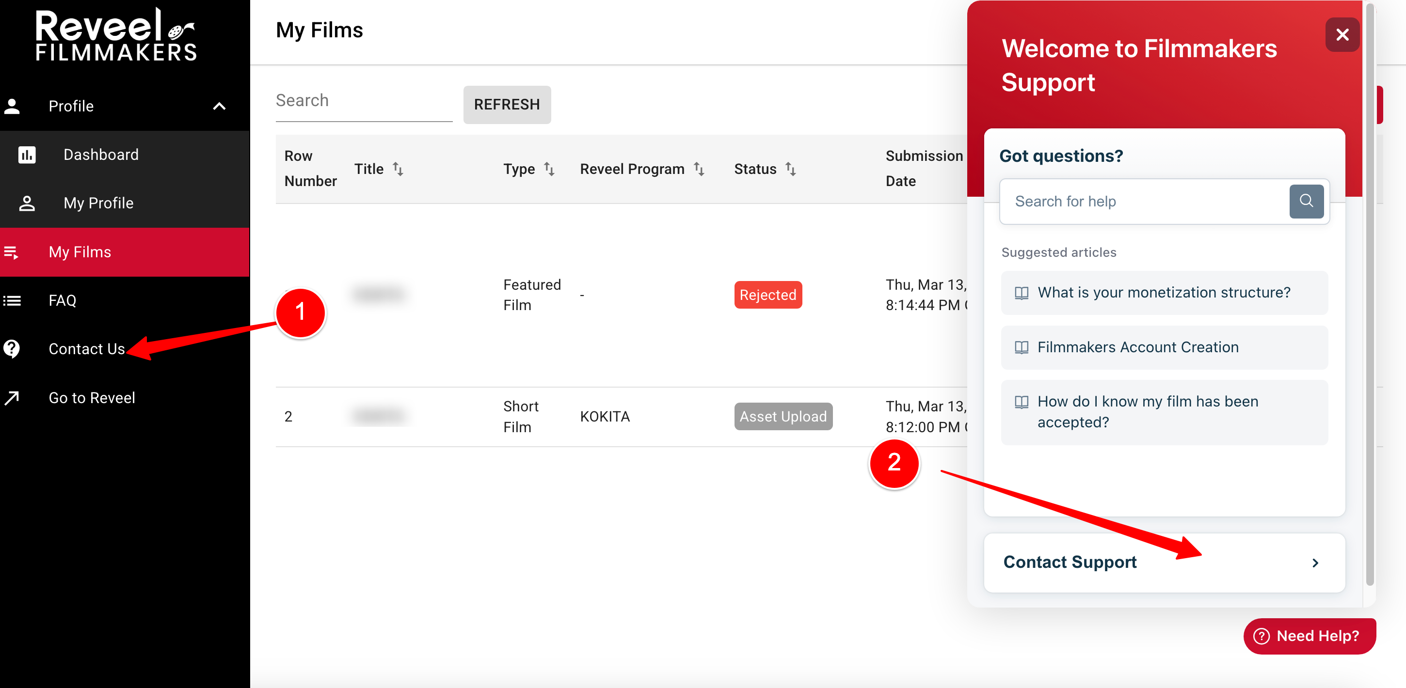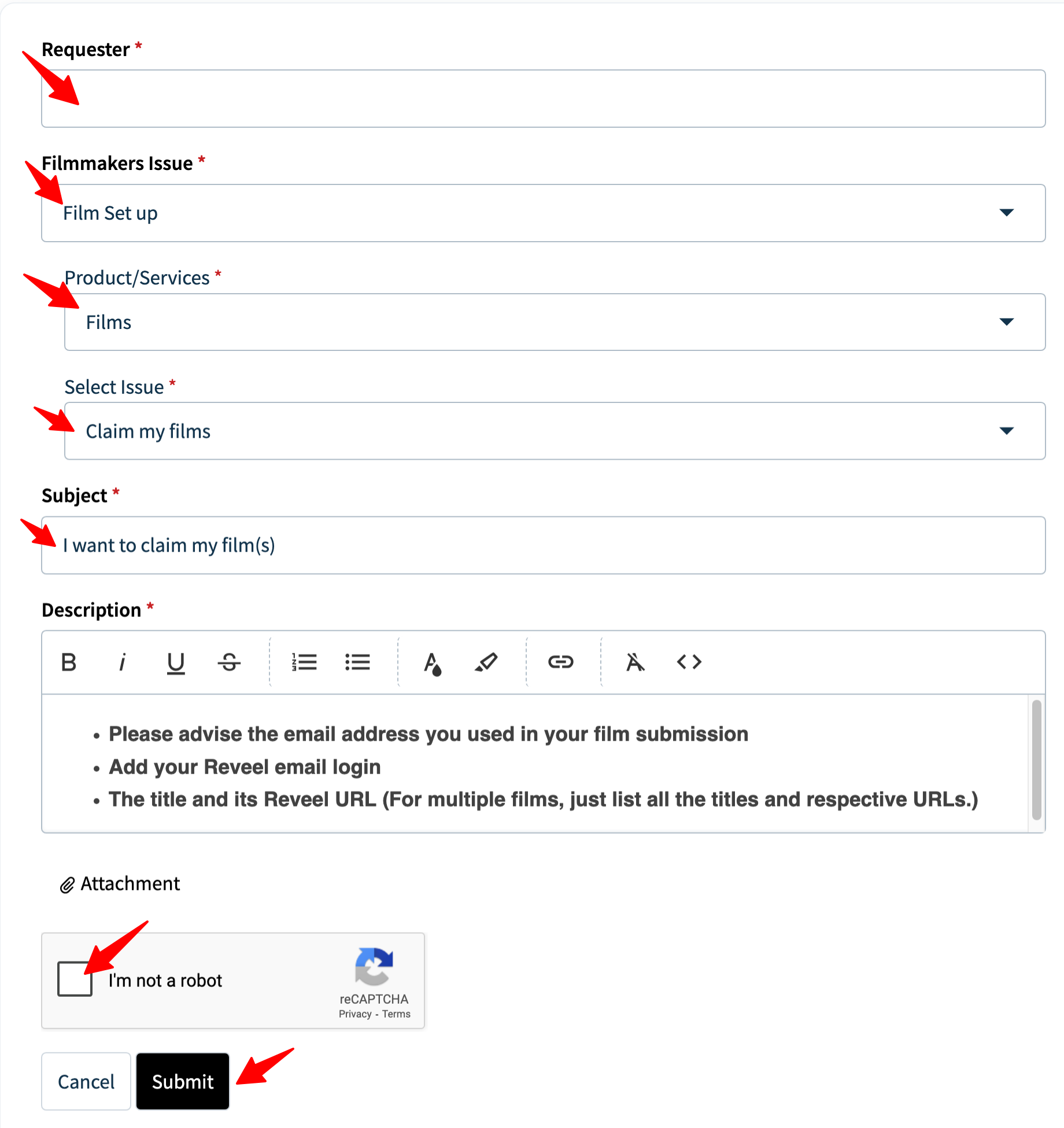 If you are not logged in yet in your filmmaker account, you can also submit a ticket following the same format as the above, https://help.reveelfilmmakers.com/support/tickets/new.