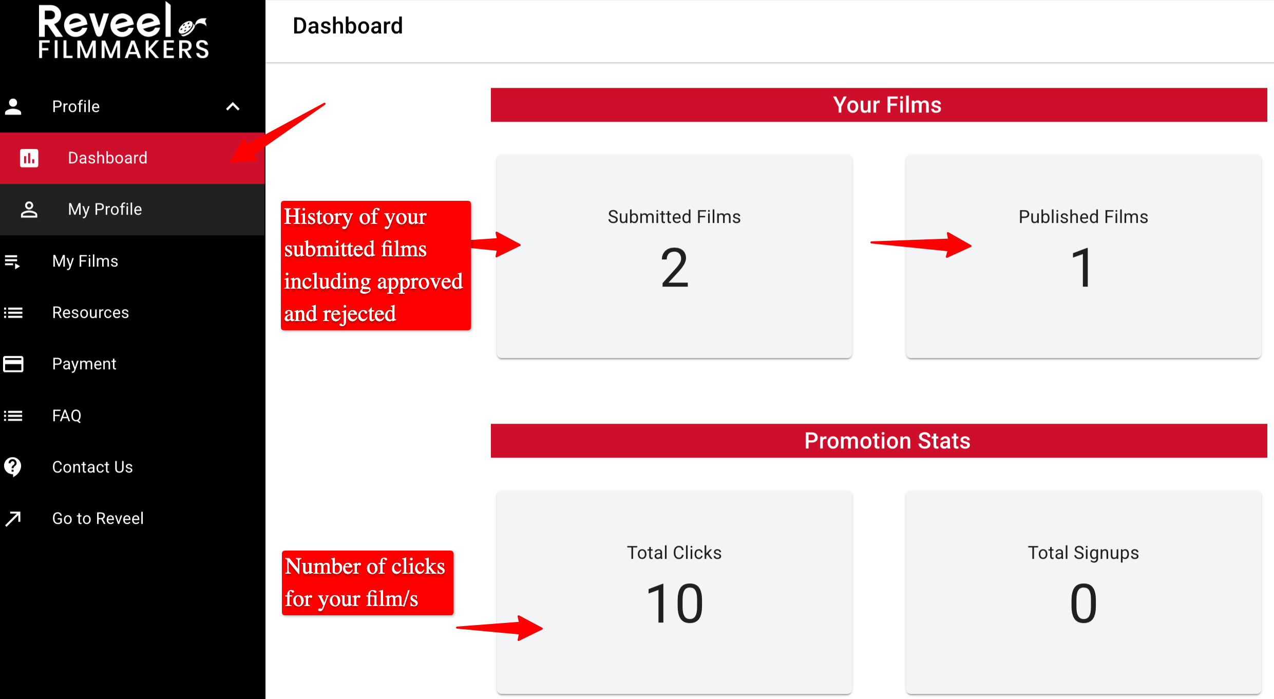 This section will usually display the number of times your short film has been clicked. Please log in to your filmmaker account and navigate to the dashboard section to access this information.