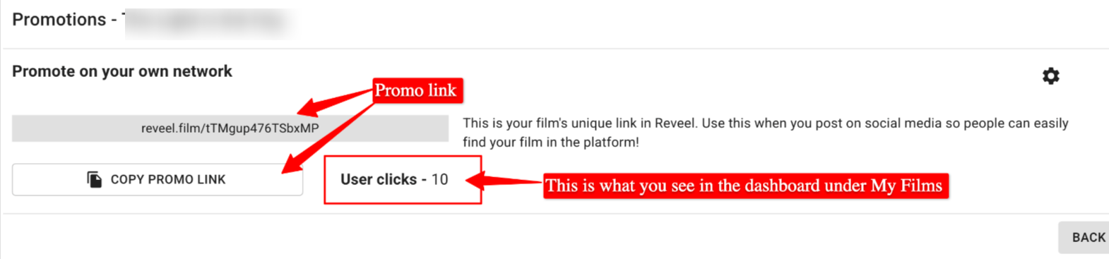 You can use the promo link to track your progress. This is your film's unique link in Reveel. You can use this when you post on social media so people can easily find your film on the platform!
